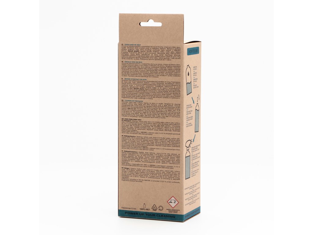 Všechny složky jsou biologicky odbouratelné a šetrné k životnímu prostředí. Láhev je vyrobená z recyklovaného plastu a umožňuje snadné a pohodlné opakované použití. Odpadá tak tahání těžkých lahví s čisticími prostředky a zároveň pomáhá šetřit planetu od plastů. Díky kombinaci účinných složek si čisticí sada snadno poradí se všemi nečistotami, prachem a nezanechává šmouhy na různých typech skleněných povrchů.